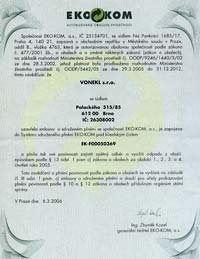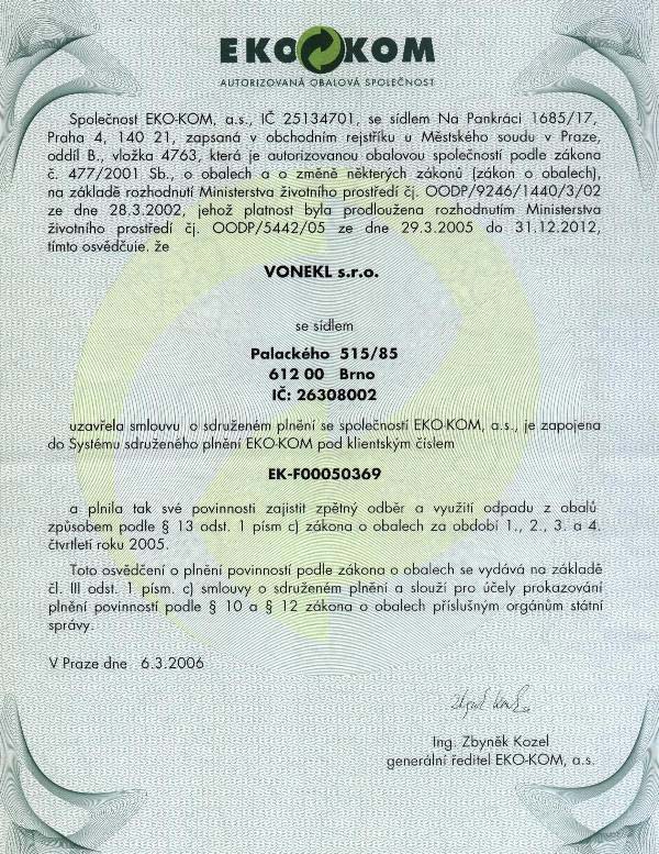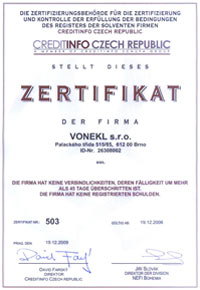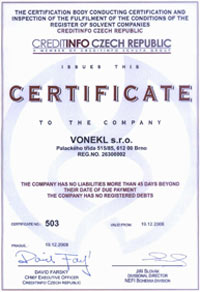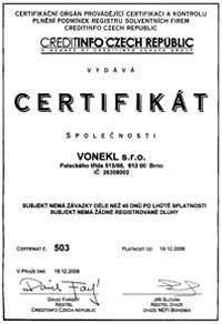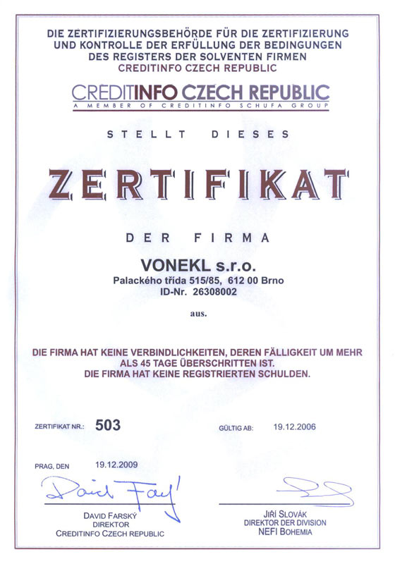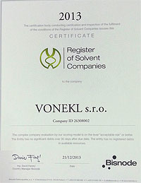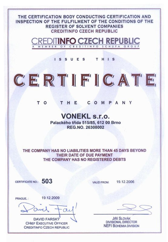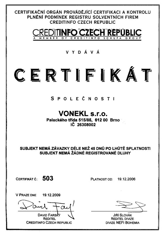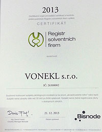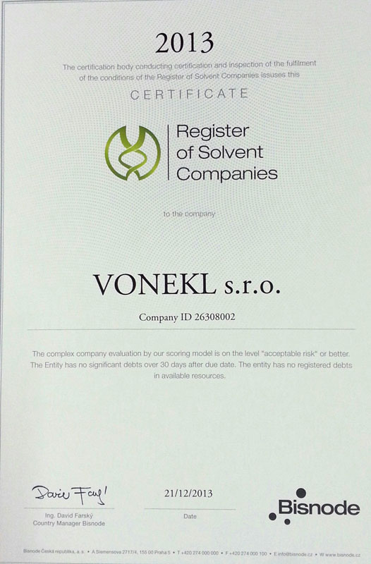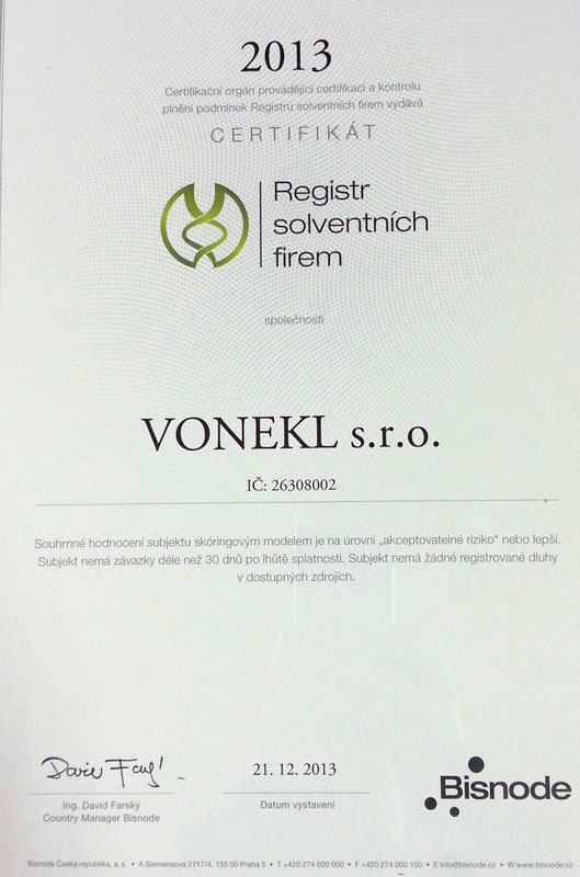 Certifikáty, prohlášení Společnost Vonekl.s.r.o. je držitelem certifikátu solventní firmy s nízkým rizikem, který vydává BISNODE Česká republika, a.s.