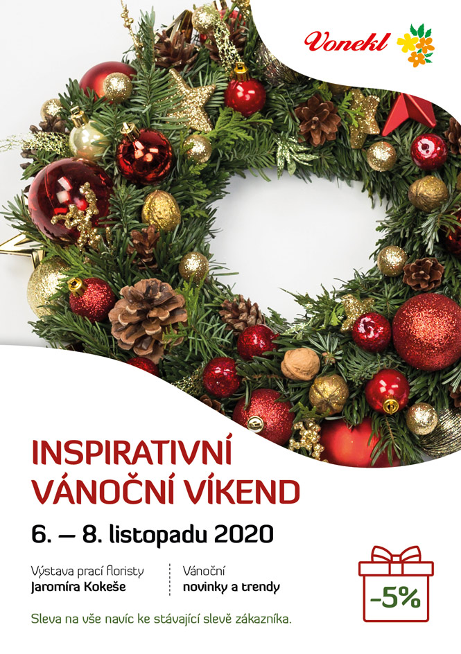 Výstava aranží a nového vánočního zboží v prostorách firmy Vonekl, kterou připravujeme ve spolupráci s floristou Jaromírem Kokešem. V době konání akce 6-8. 11. 2020 bude při nákupu ve firmě Vonekl poskytnuta zákazníkům navíc sleva 5 %.