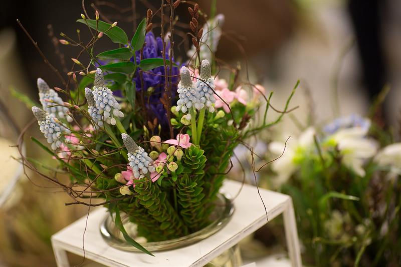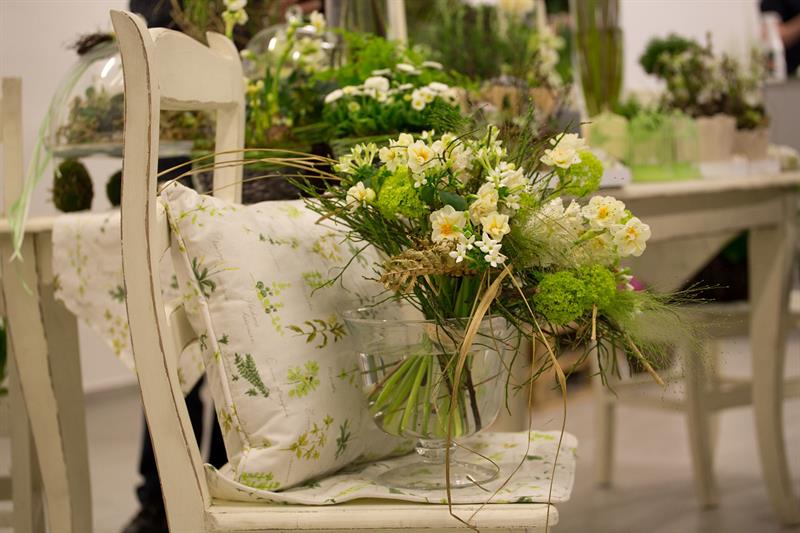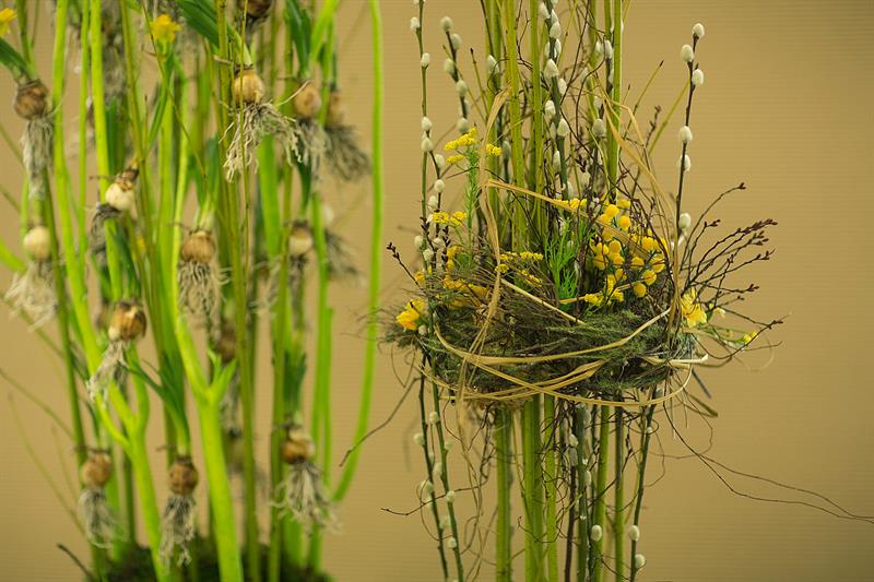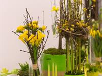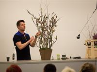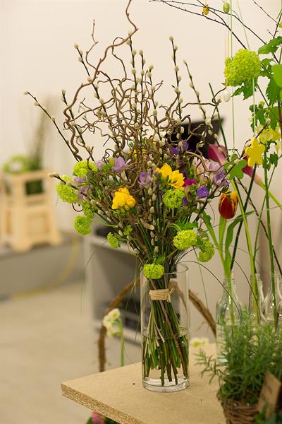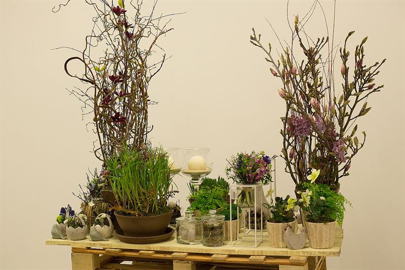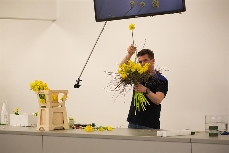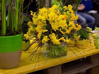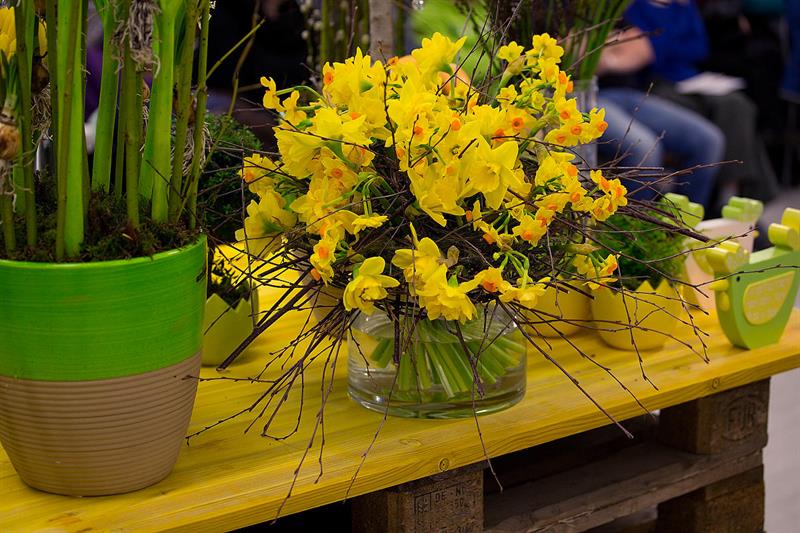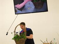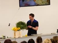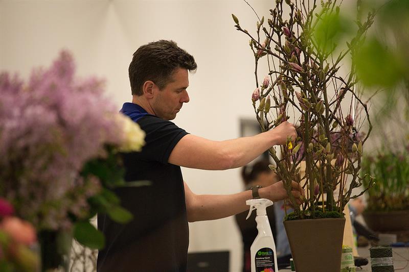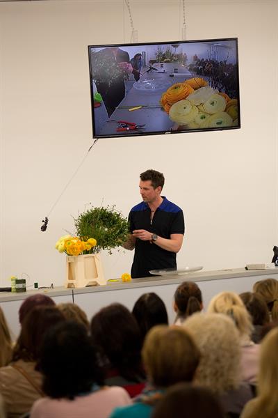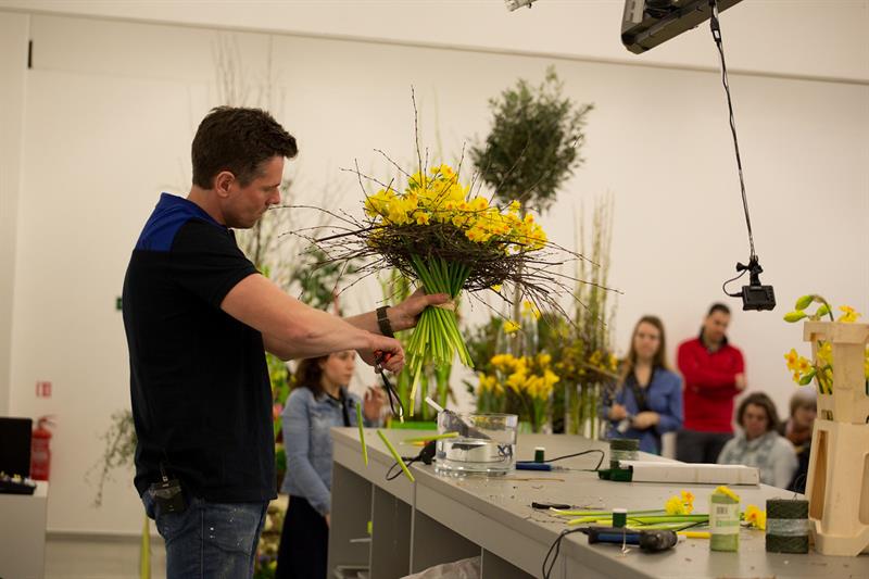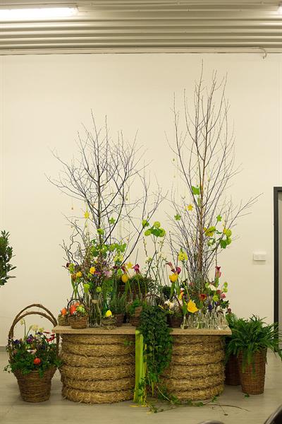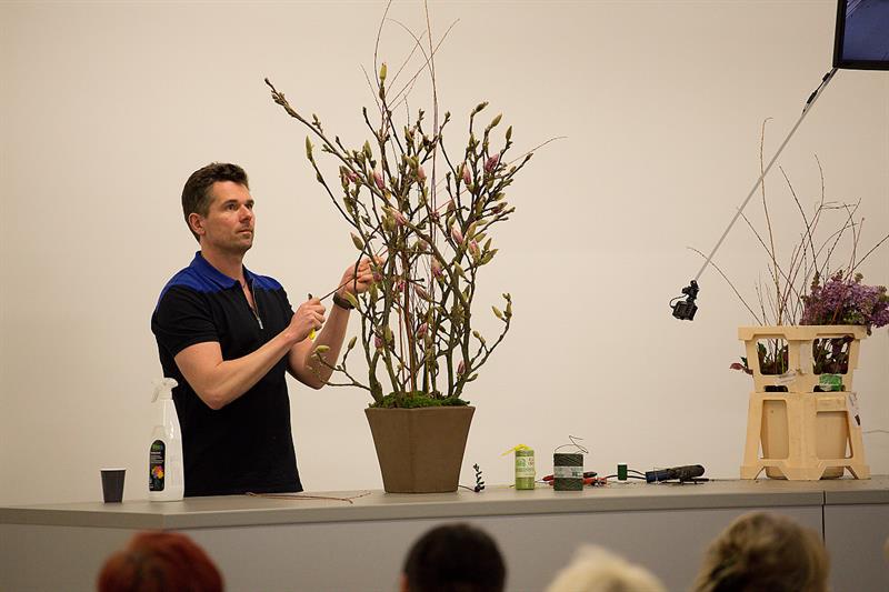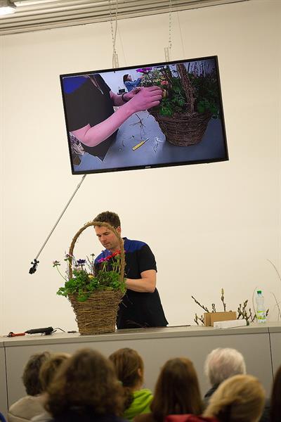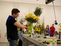 jarní inspirace. Michal Haut se snažil představit celkový koncept vystavování zboží v obchodě a vytvořil tématické celky, kam postupně doplňoval své práce. Během semináře byly představeny řezané květiny, které patří k jaru a ne vždy jsou tolik vidět v květinářstvích. Jedná se například o řezané Muscari, Hyacinthus, Magnolia, Cornus, Prunus, Viburnum, Syringa, Ranunculus Cloney.