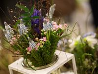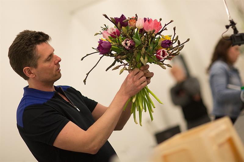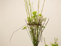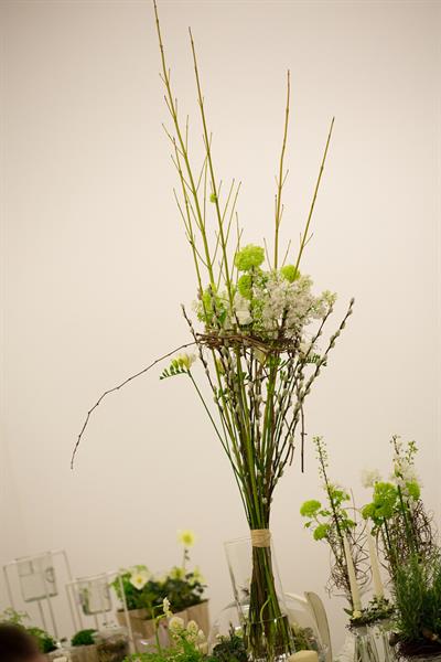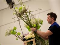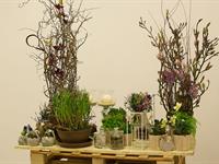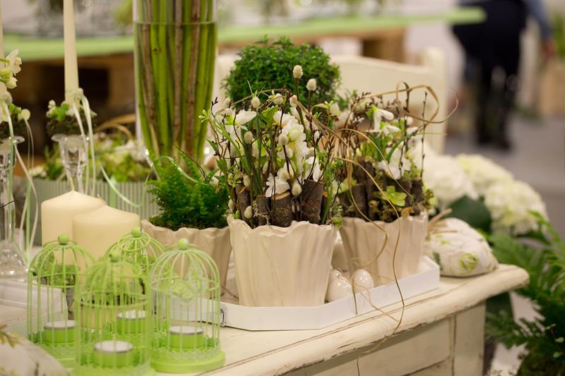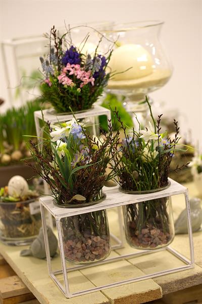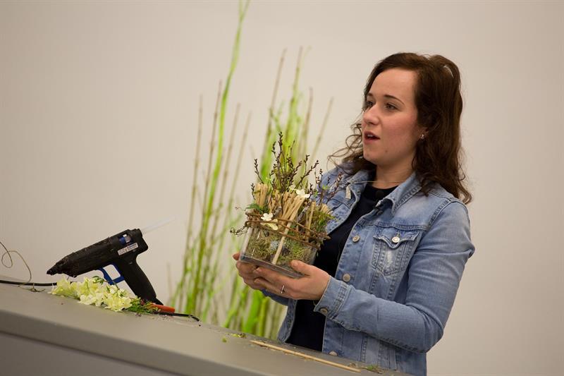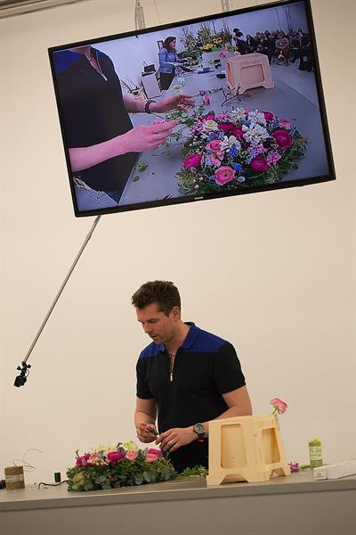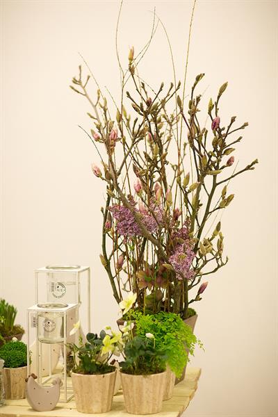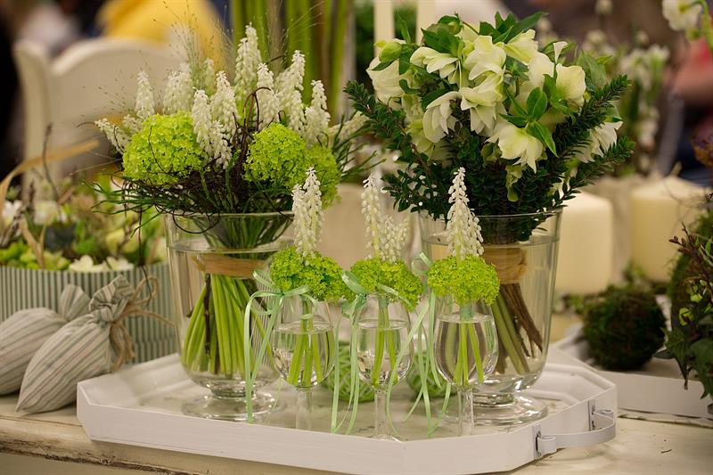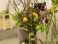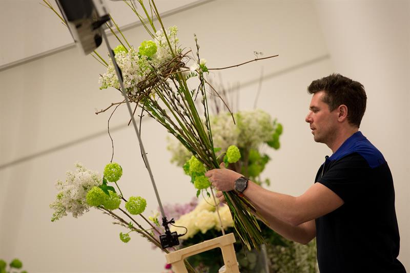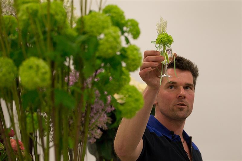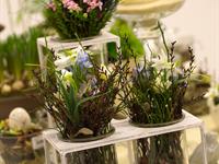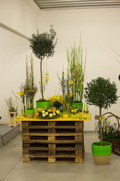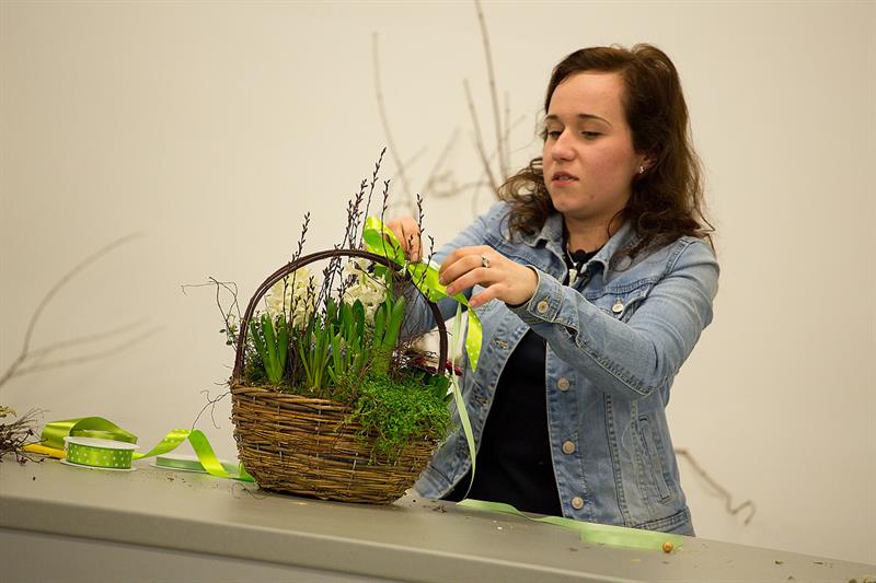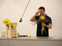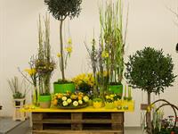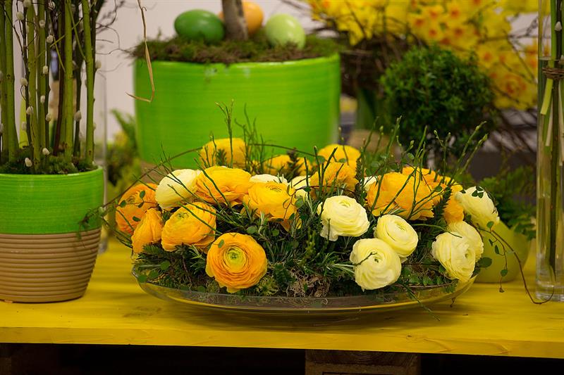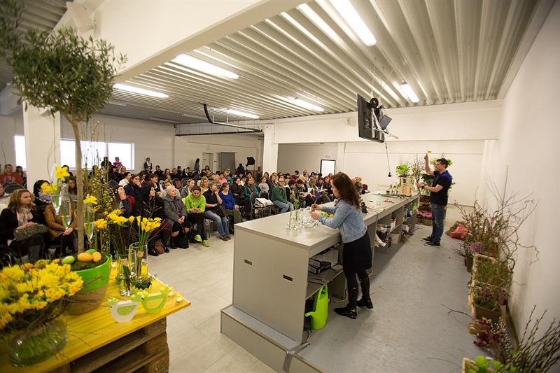 jarní inspirace. Michal Haut se snažil představit celkový koncept vystavování zboží v obchodě a vytvořil tématické celky, kam postupně doplňoval své práce. Během semináře byly představeny řezané květiny, které patří k jaru a ne vždy jsou tolik vidět v květinářstvích. Jedná se například o řezané Muscari, Hyacinthus, Magnolia, Cornus, Prunus, Viburnum, Syringa, Ranunculus Cloney.