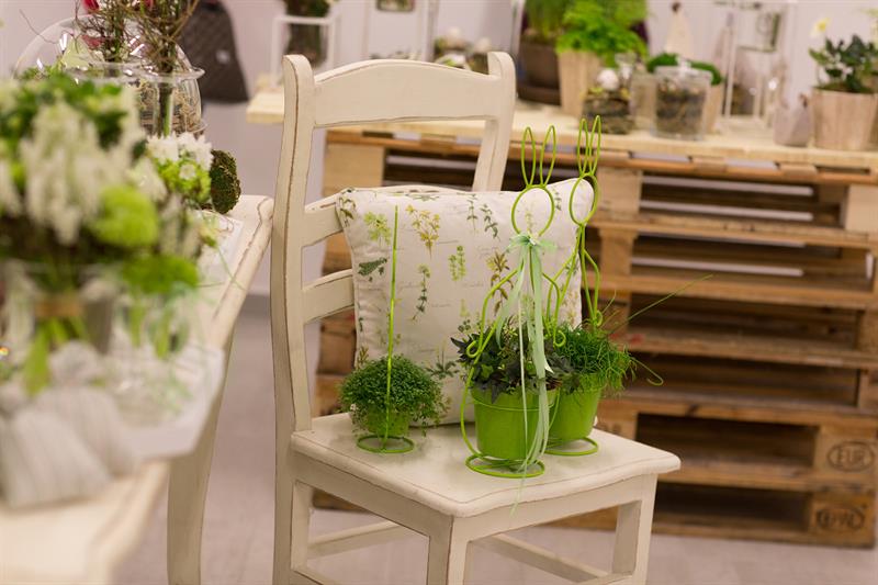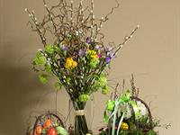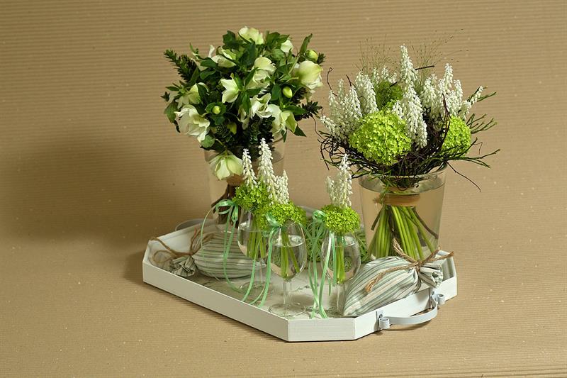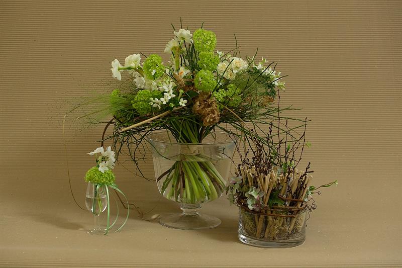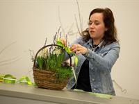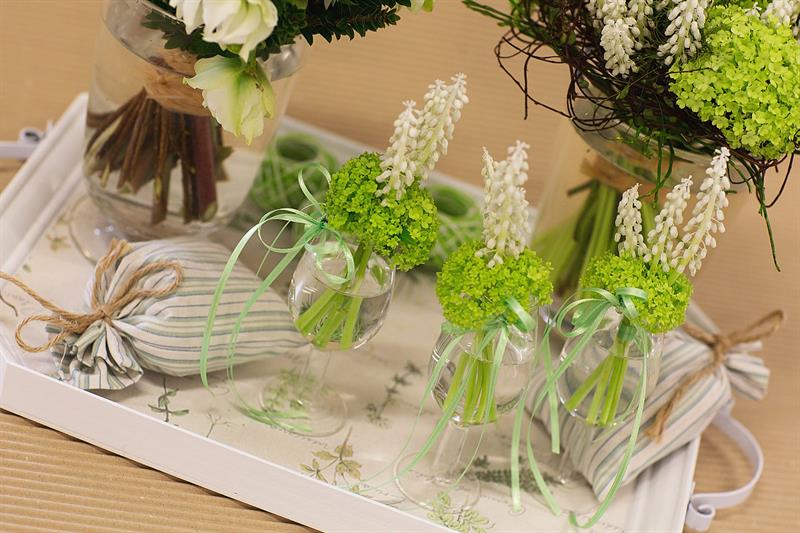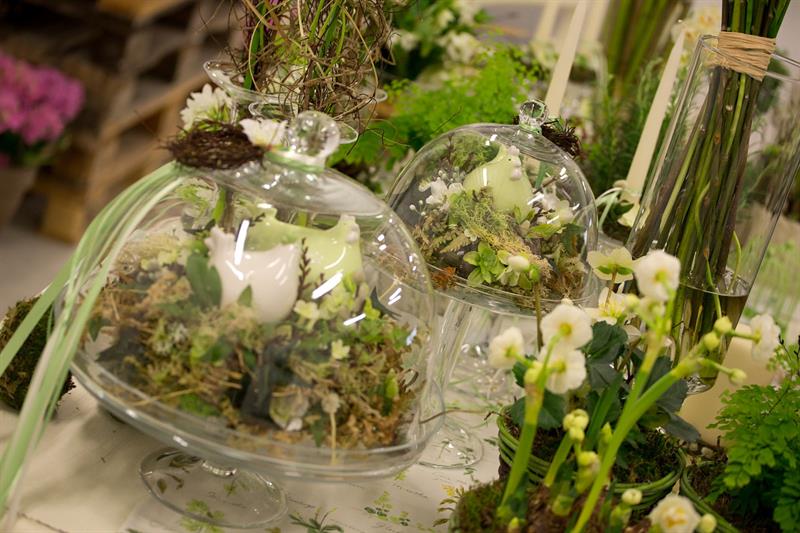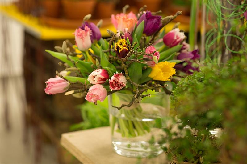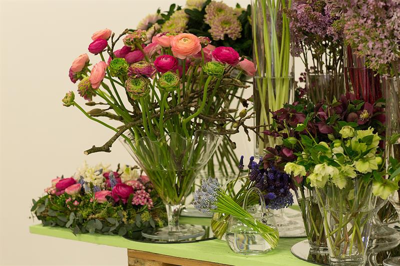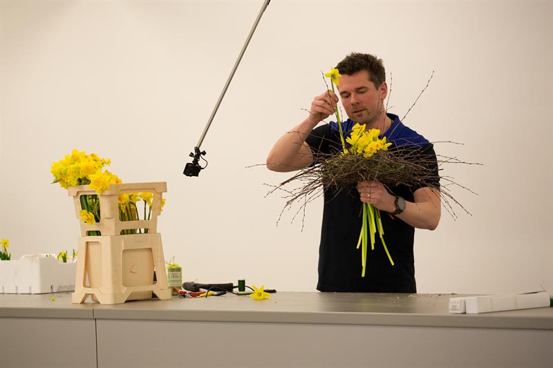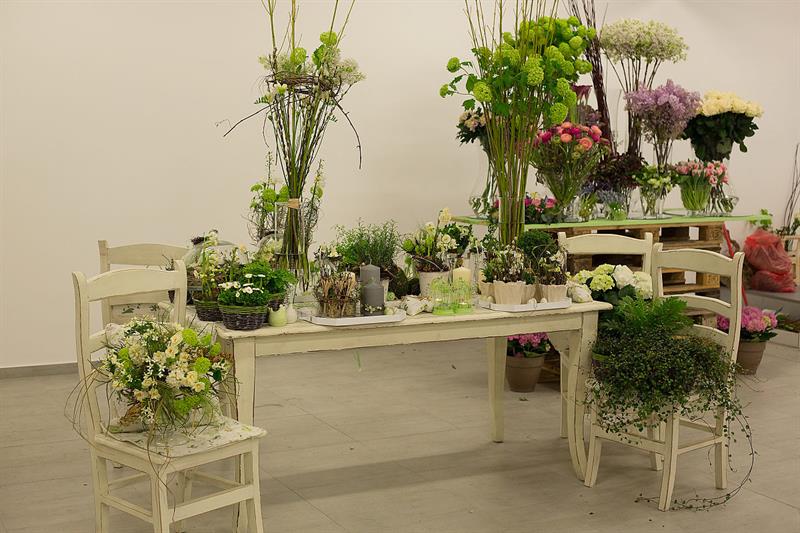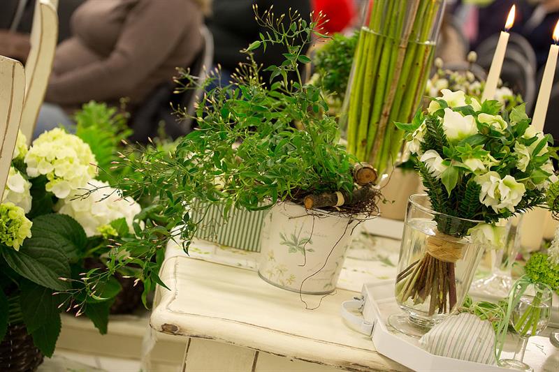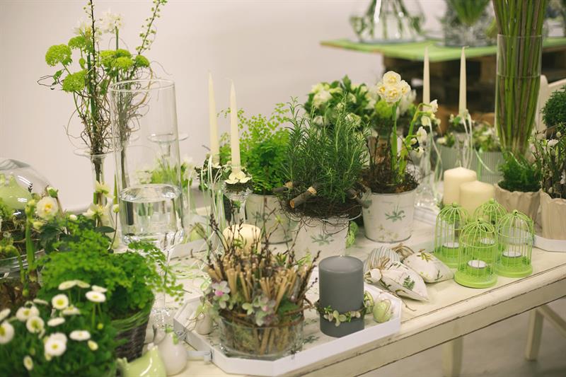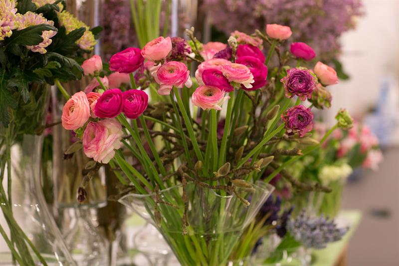 jarní inspirace. Michal Haut se snažil představit celkový koncept vystavování zboží v obchodě a vytvořil tématické celky, kam postupně doplňoval své práce. Během semináře byly představeny řezané květiny, které patří k jaru a ne vždy jsou tolik vidět v květinářstvích. Jedná se například o řezané Muscari, Hyacinthus, Magnolia, Cornus, Prunus, Viburnum, Syringa, Ranunculus Cloney.