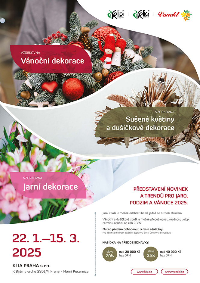 jak je již tradicí, máme pro Vás naši letošní vánoční nabídku v předstihu. Vánoční vzorkovna je k vidění na naší pobočce Klia v Praze, kde si můžete po předchozí domluvě předobjednat zboží a zároveň sjednat termín, kdy chcete zboží odebrat. Bonusem je opět výrazná sleva na objednávky (podmínky slevy jsou uvedeny na pozvánce níže).